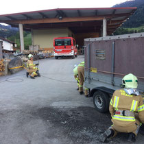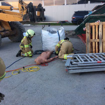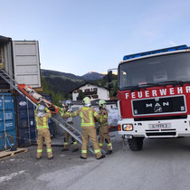 Eine Person wurde in einem aufgestapelten Container bewusstlos. Die Mannschaft des TLF konnte die Person mittels Leiter und Schleifkorbtrage bergen. Auch die richtige Eigensicherung für die Bergungsarbeit in der Höhe wurde in diesem Zusammenhang geübt.