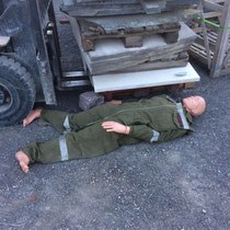 Eine Person wurde unter einem Sack voller Pflastersteine eingeklemmt. Durch Verwendung des Hebekissensatzes konnte ein Teil der Mannschaft des LF-B diese Person befreien.